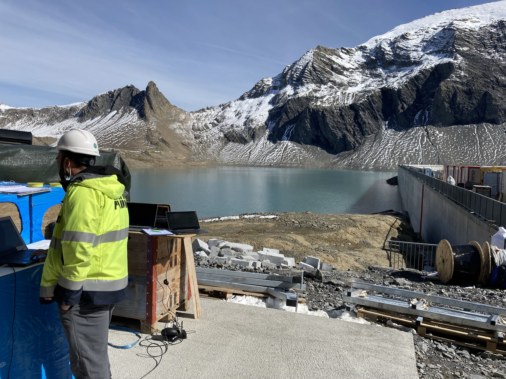 Il a fallu transporter en hélicoptère le dispositif de 1800 kilogrammes ainsi que le matériau restant et le personnel, jusqu’au mur de barrage. Toutefois, l’hélicoptère ne pouvait voler que par beau temps, ce qui rendait encore plus difficile la planification du montage et la mise en service, car il était impossible de travailler sans hélicoptère.